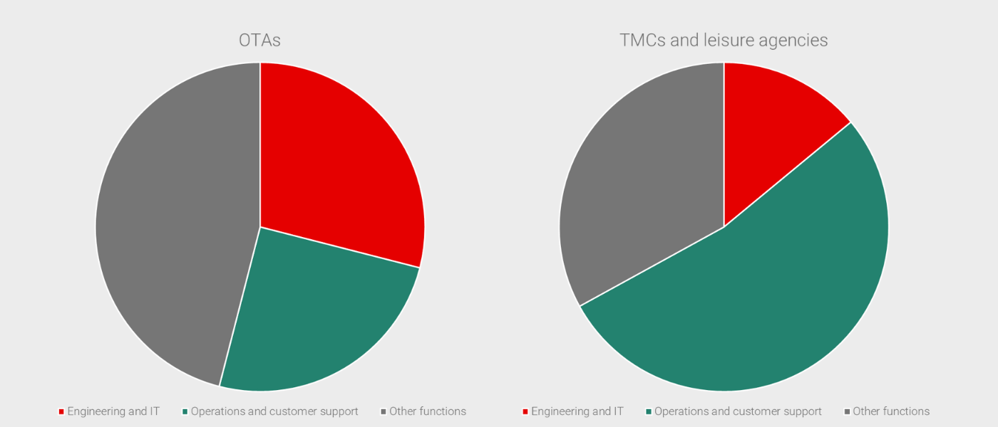 Looking at fifteen leading OTAs, their engineering and IT departments make up an average of 29% of the employee base compared to 14% for travel management companies (TMCs) and traditional leisure agencies. The inverse is true for operations and customer support at 25% and 53% respectively where OTAs lead the industry with do-it-yourself servicing capabilities.