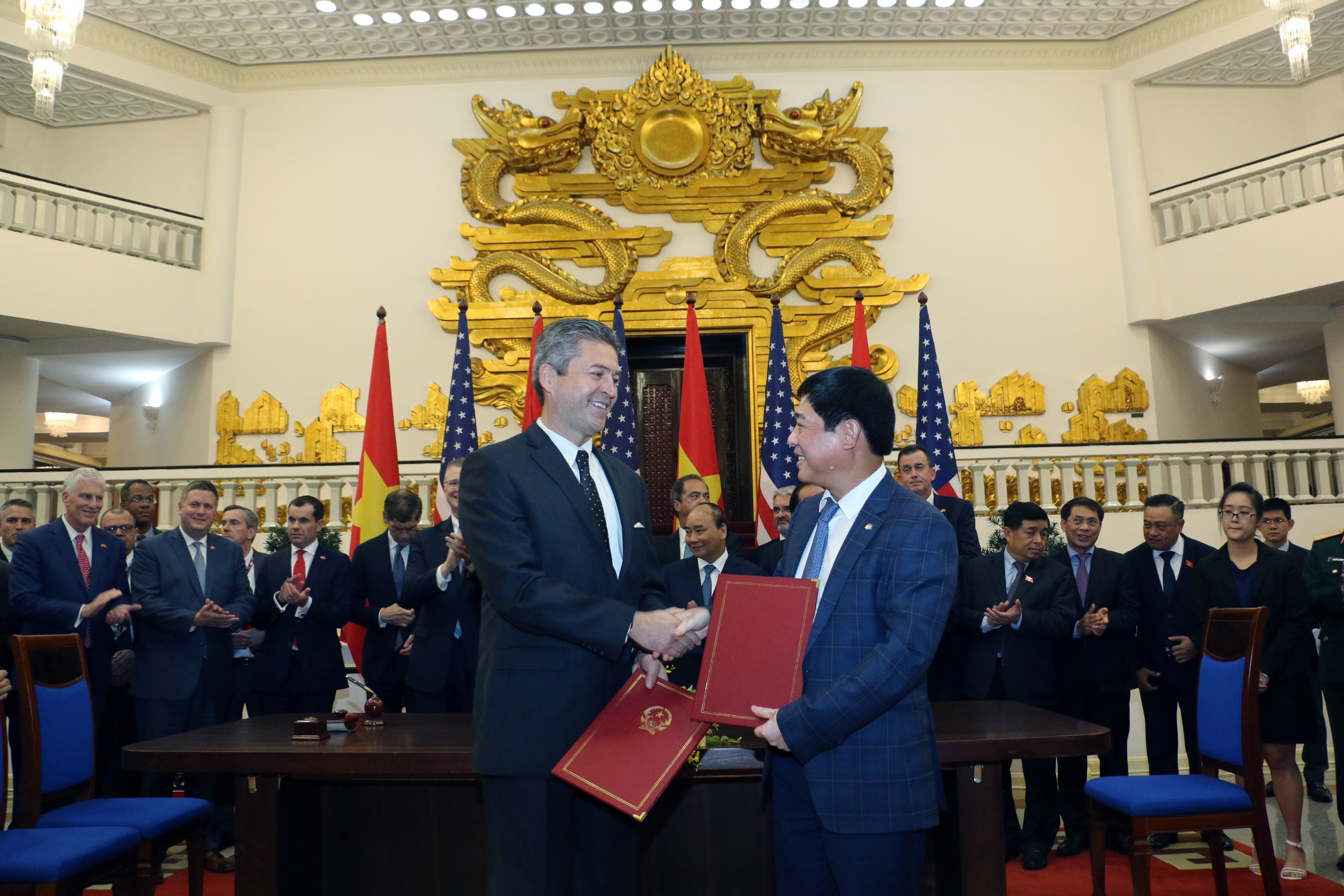 Cem Tanyel, executive vice president and president, Sabre Airline Solutions, and Trinh Hong Quang, executive vice president, Vietnam Airlines, shake hands following a signing ceremony in the office of the Prime Minister of the Socialist Republic of Vietnam. The ceremony was held in the presence of Prime Minister Nguyen Xuan Phuc; Wilbur Louis Ross Jr., United States secretary of commerce; and representatives from both countries.