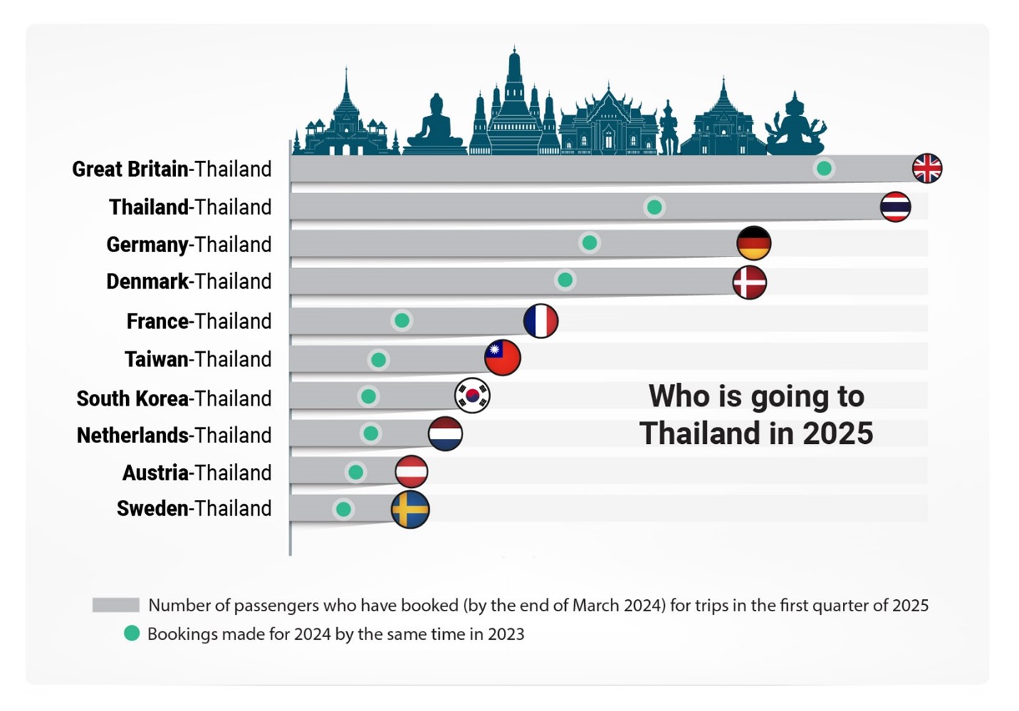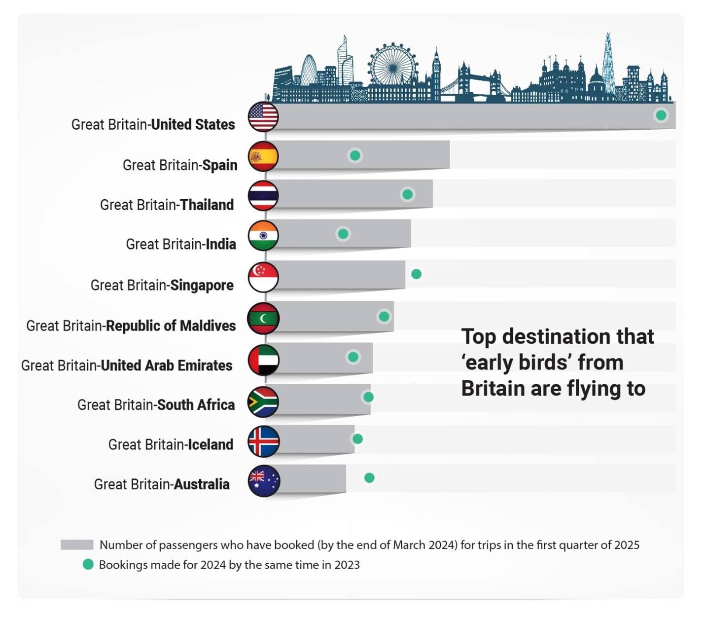 And, it appears that booking early is an increasing trend among travelers who could be keen to ensure the exact trip they want is available, or that they can better prioritize and manage their travel budget. Early bird bookings have grown for Britain, when compared with bookings made during 2023 for 2024, according to Sabre’s data, which is made up of bookings made for Q1 2025 up to end March 2024. Korea, Thailand, and Taiwan are also more likely this year to have made plans for next year.