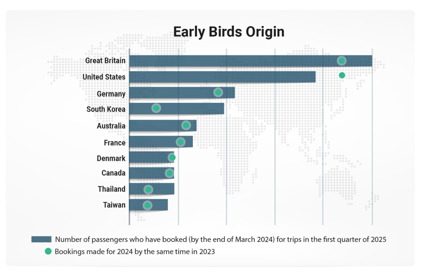 They are followed by holidaymakers from the US, Germany, Korea, and Australia, who have also already made travel plans well in advance. Also making up the top 10 early bookers for 2025 are France, Denmark, Canada, Thailand, and Taiwan.
