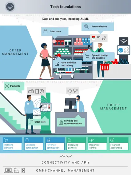 Taking inspiration from another industry which has evolved to better meet consumer demand, the illustration below uses a modern grocery store analogy – with a wide choice of products, bundled offers, flexible shopping and payment options – to adapt the original IATA diagram (included in their October 2021 whitepaper) to show Sabre’s view on the core building blocks that are critical to an end-state offer and order solution.