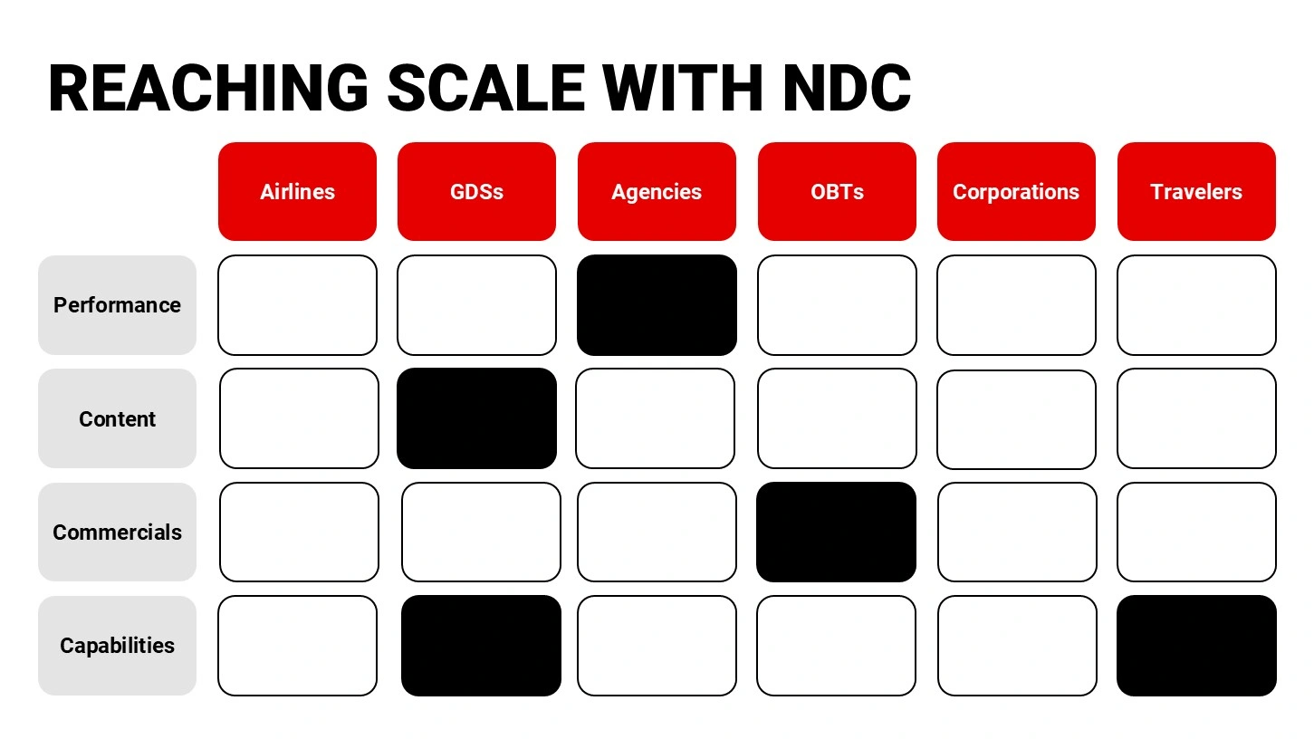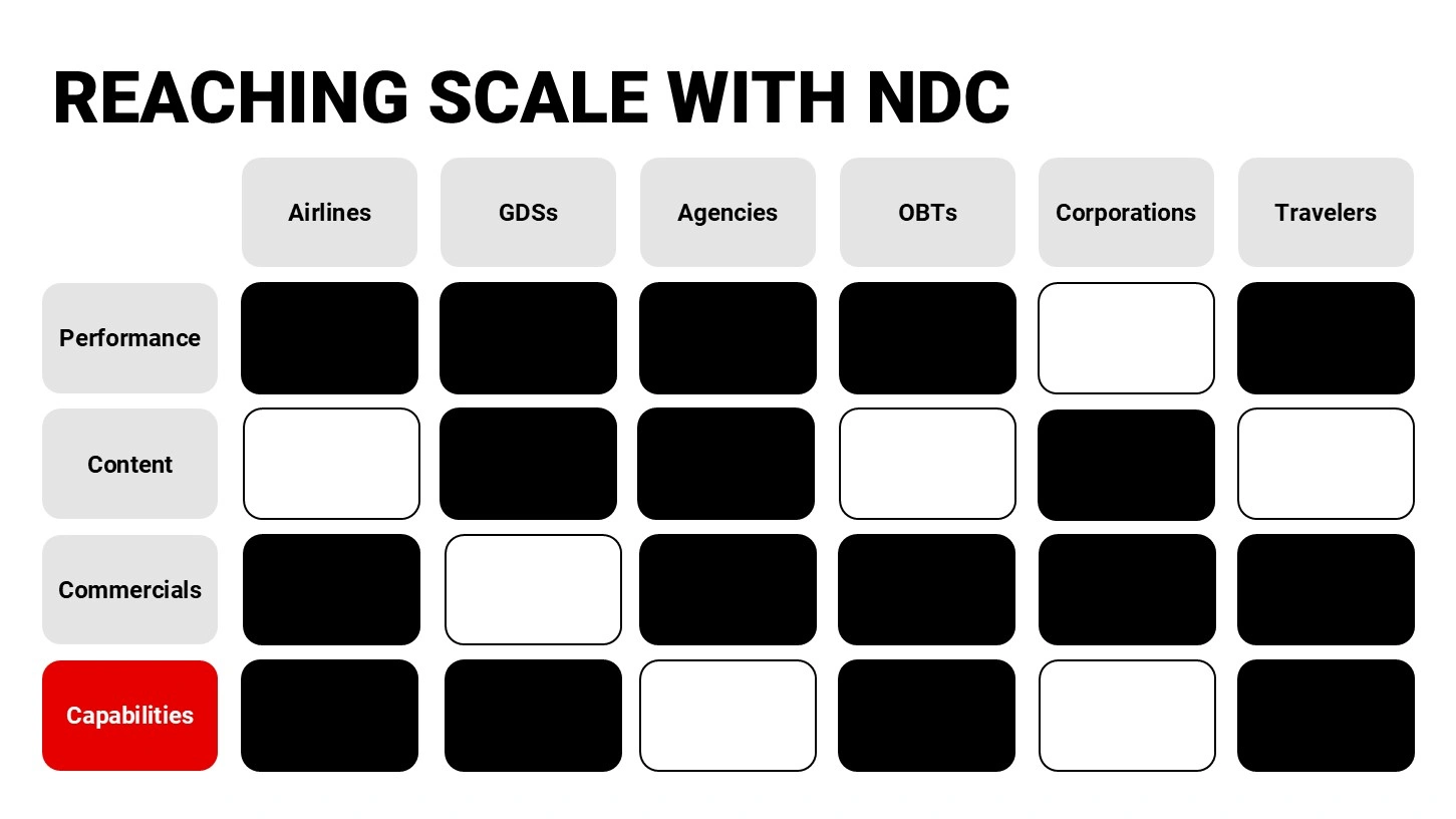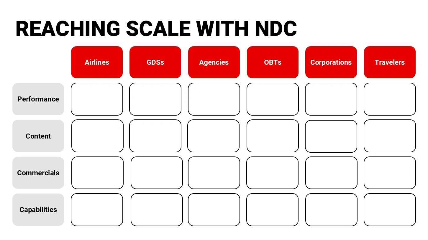 To achieve scale, airlines, GDSs, agencies, OBTs and corporate buyers need to fill their lines of the card. No single stakeholder can crack the code alone—we need all boxes filled to win. To help track progress we’ve created a scorecard for scaling NDC.