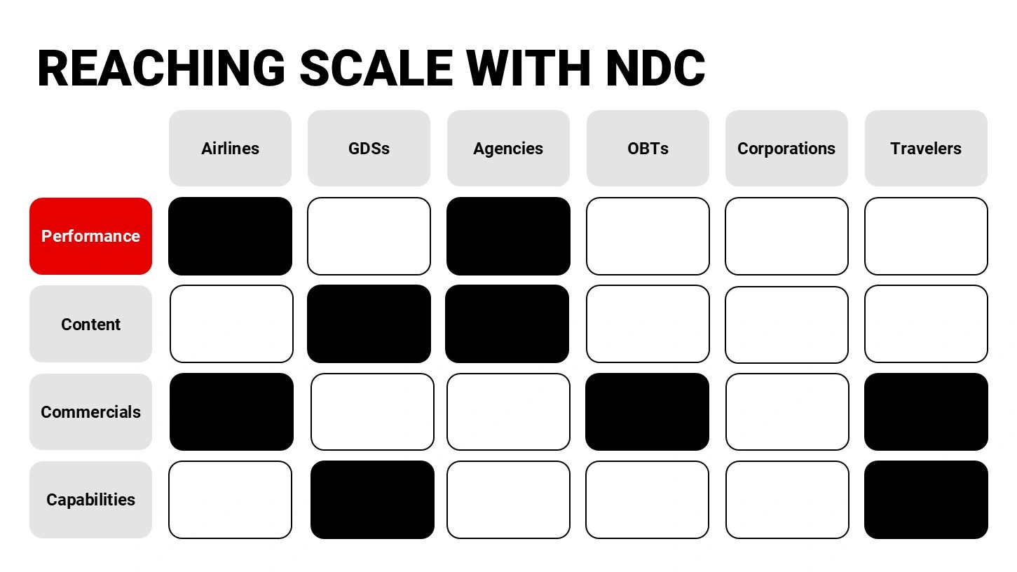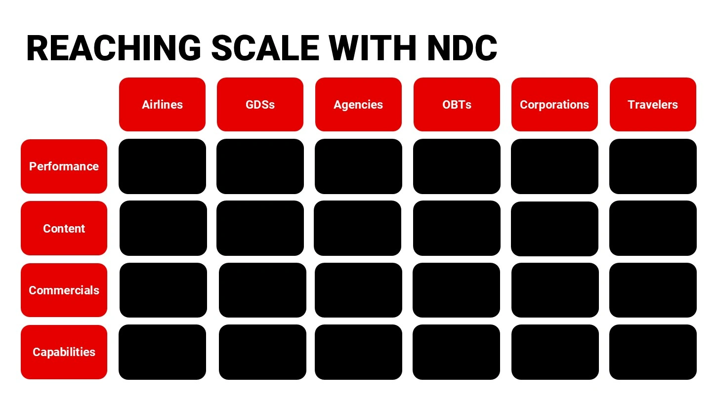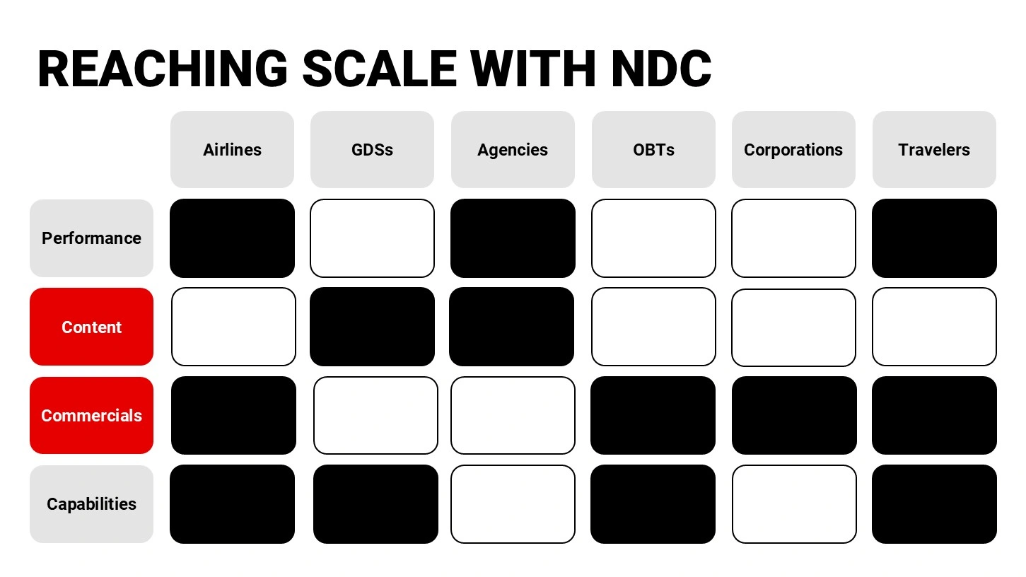To achieve scale, airlines, GDSs, agencies, OBTs and corporate buyers need to fill their lines of the card. No single stakeholder can crack the code alone—we need all boxes filled to win. To help track progress we’ve created a scorecard for scaling NDC.